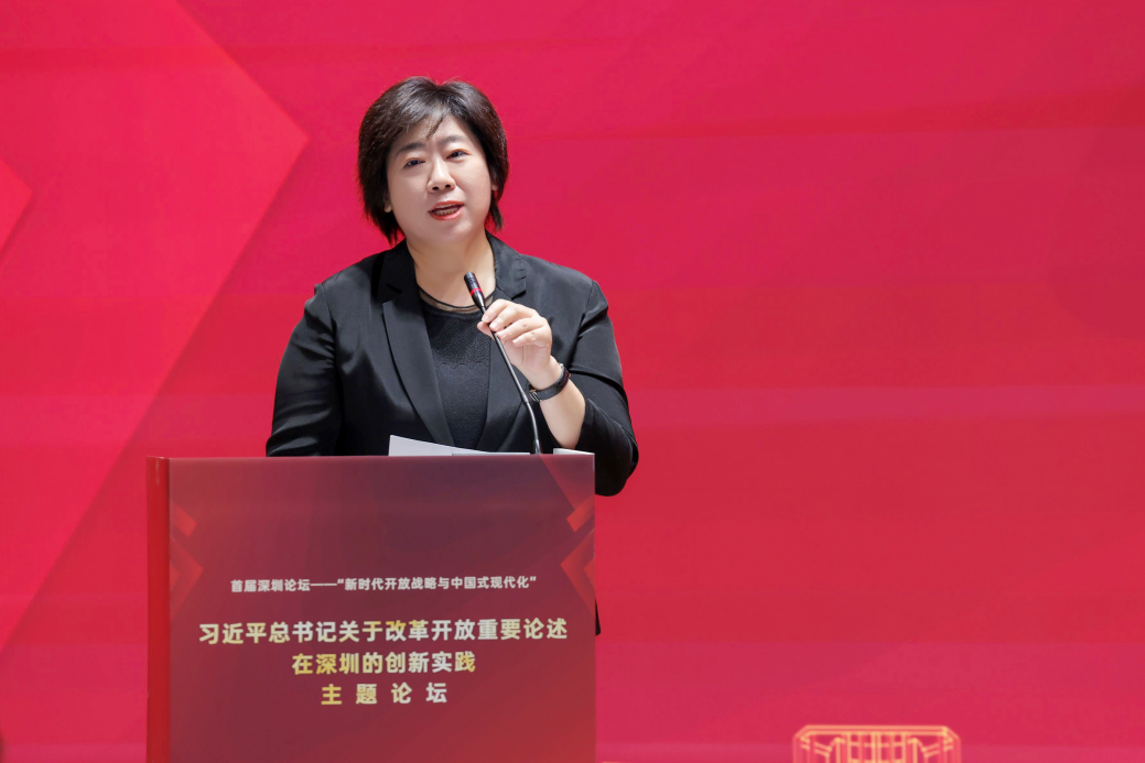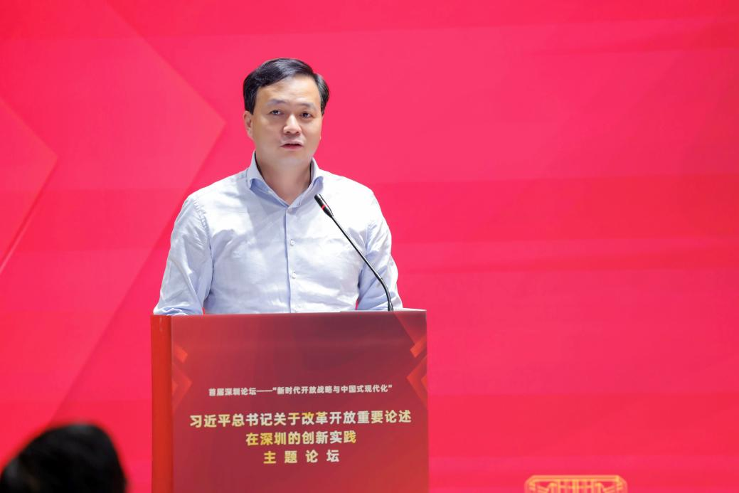 王易表示,习近平总书记关于改革开放重要论述,是习近平新时代中国特色社会主义思想的重要组成部分,是推进新时代改革开放事业蓬勃发展的根本遵循。在习近平总书记在深圳经济特区建立40周年庆祝大会上发表重要讲话三周年之际,举办首届深圳论坛及中国式现代化深圳创新实践研究基地启用仪式,是发挥中国人民大学特色优势,进一步深入贯彻落实习近平总书记在中国人民大学考察调研时重要讲话精神的最新举措,也是中国人民大学建设人文社会科学研究和教学领域的重要人才中心和创新高地的重要体现。新时代新征程上,中国人民大学社会科学高等研究院(深圳)和中国式现代化深圳创新实践研究基地肩负着助力建设中国特色社会主义先行示范区和粤港澳大湾区的历史使命,将为“双区”建设发展提供思想支撑、人才支撑、技术支撑和智力支撑。中国人民大学将同深圳社会各界一道,永葆“闯”的精神、“创”的劲头、“干”的作风,同心同德、群策群力、坚定信心、勇毅前行,与深圳一同团结奋斗,奋力谱写更多“春天的故事”,为全面建设社会主义现代化国家、全面推进中华民族伟大复兴作出人大贡献。