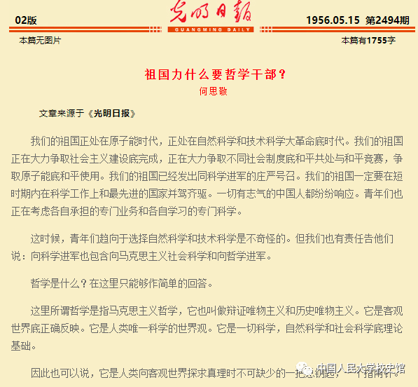 1956年,何思敬在《光明日报》发表文章《祖国为什么要哲学干部》,号召有志青年学习哲学。