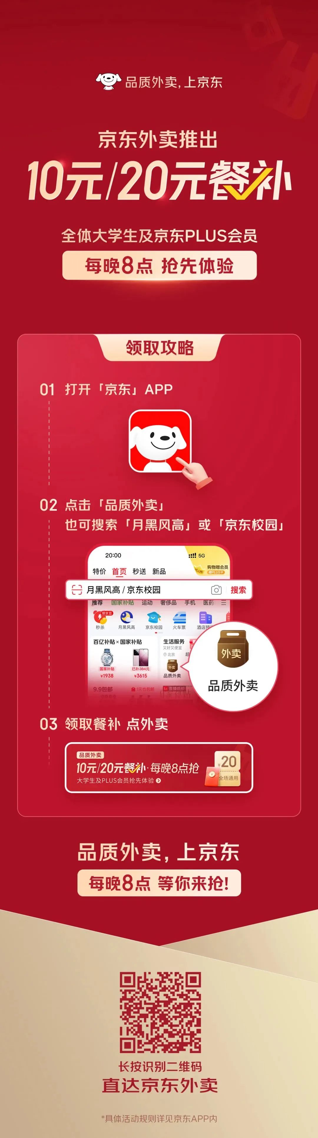 @全体大学生和京东PLUS会员: 京东外卖餐补来了!!! 面额超大,10元/20元随机领 范围很广,京东外卖上线的所有餐饮门店都能用 每天都有,今天起每晚8点都可领取 品质外卖,上京东! 每晚8点,等你来抢!