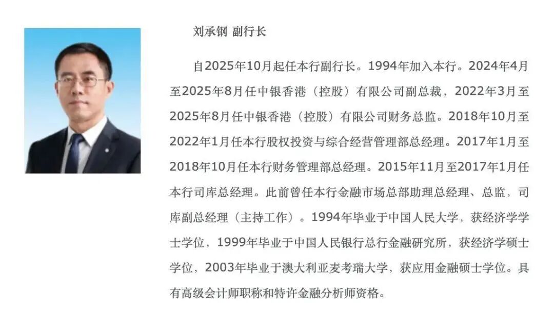 10月27日,中国银行(601988.SH)公告称,2025年10月24日起,刘承钢就任副行长。 据中国银行网站,刘承钢,1990-1994年就读于中国人民大学投资经济系投资经济专业,获经济学学士学位;1999年毕业于中国人民银行总行金融研究所,获经济学硕士学位;2003年毕业于澳大利亚麦考瑞大学,获应用金融硕士学位。具有高级会计师职称和特许金融分析师资格。 刘承钢于1994年7...